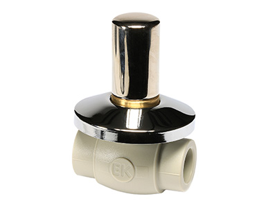 PPR podomítkový ventil. Určeno pro uzavírání potrubí s ovládáním nad úrovní povrchu stavební konstrukce, krytka je kovová.