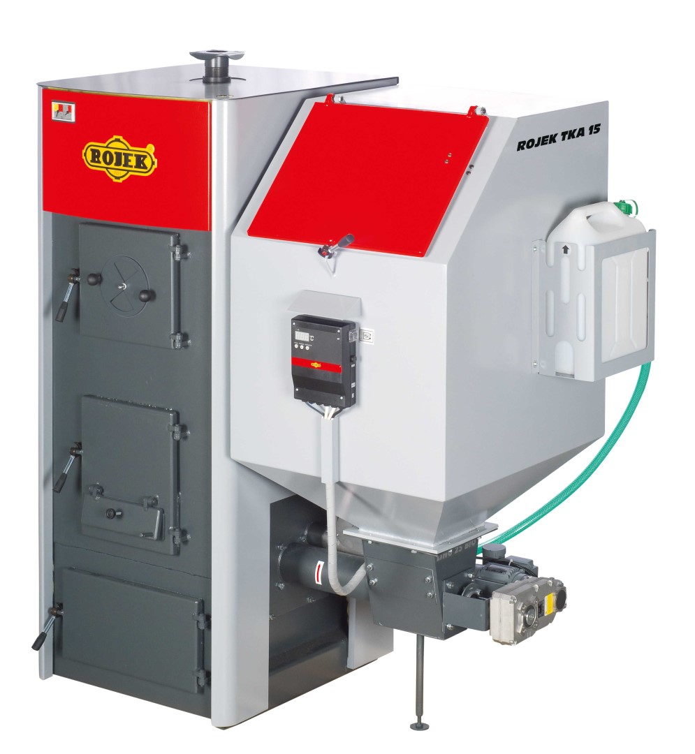 Automatický teplovodní kotel ROJEK TKA BIO 15 umožňuje automaticky spalovat dřevěné pelety o průměru 6 – 8 mm - kvalitní bílé, ale i s přídavkem kůry.