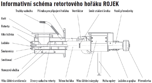 Automatický teplovodní kotel ROJEK TKA BIO 15 umožňuje automaticky spalovat dřevěné pelety o průměru 6 – 8 mm, kvalitní bílé, ale i s příměsí kůry. V kotli je instalován retortový hořák, který je konstruován na principu spodní dodávky paliva do spalovací části a samotné spalování připomíná hoření v kovářské výhni. Z násypky hořáku je palivo dodáváno šnekovým podavačem do litinového kolena retorty. Zde je vytlačováno vzhůru na kruhový rošt. Retorta je umístěna ve směšovači, do kterého je foukán vzduch ventilátorem. Vyhořelé palivo - popel a struska - přepadávají přes okraje roštu do popelníku.