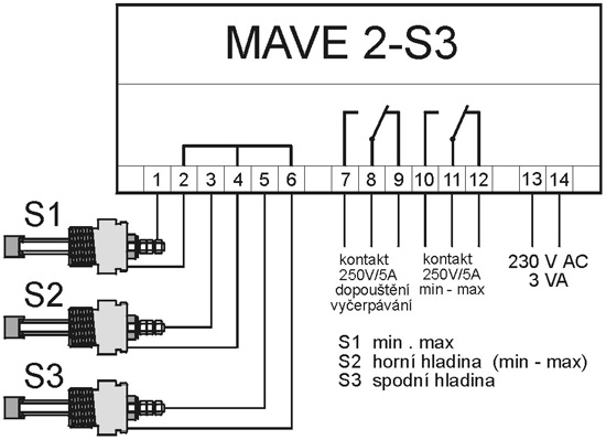Tento výrobek nahrazuje funkce výrobků MAVE 2-S1 a MAVE 2-S2. Slouží pro snímání minimální nebo maximální hladiny a současně pro ovládání dopouštění nebo vyčerpávání. Toto lze výhodně využít např. u kotlů, kde ovládáme dopouštění a současně hlídáme minimální hladinu nebo např. nádrže kondenzátu, kde snímač použijeme pro ovládání vyčerpávání a hlídání maximální hladiny, nebo při použití ponorných sond ovládáme spínání kalového čerpadla a současně hlídáme zaplavení. Sondu S1 používáme na hlídání minimální nebo maximální hladiny. Sondy S2 a S3 používáme pro doplňování nebo vyčerpávání. Sonda S2 je vždy zapojena jako horní, sonda S3 je zapojena jako spodní..