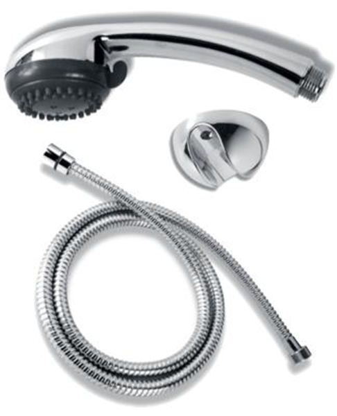 Souprava obsahuje 2-polohovou sprchovou růžici, kovovou hadici 150 cm a držák sprchy.
