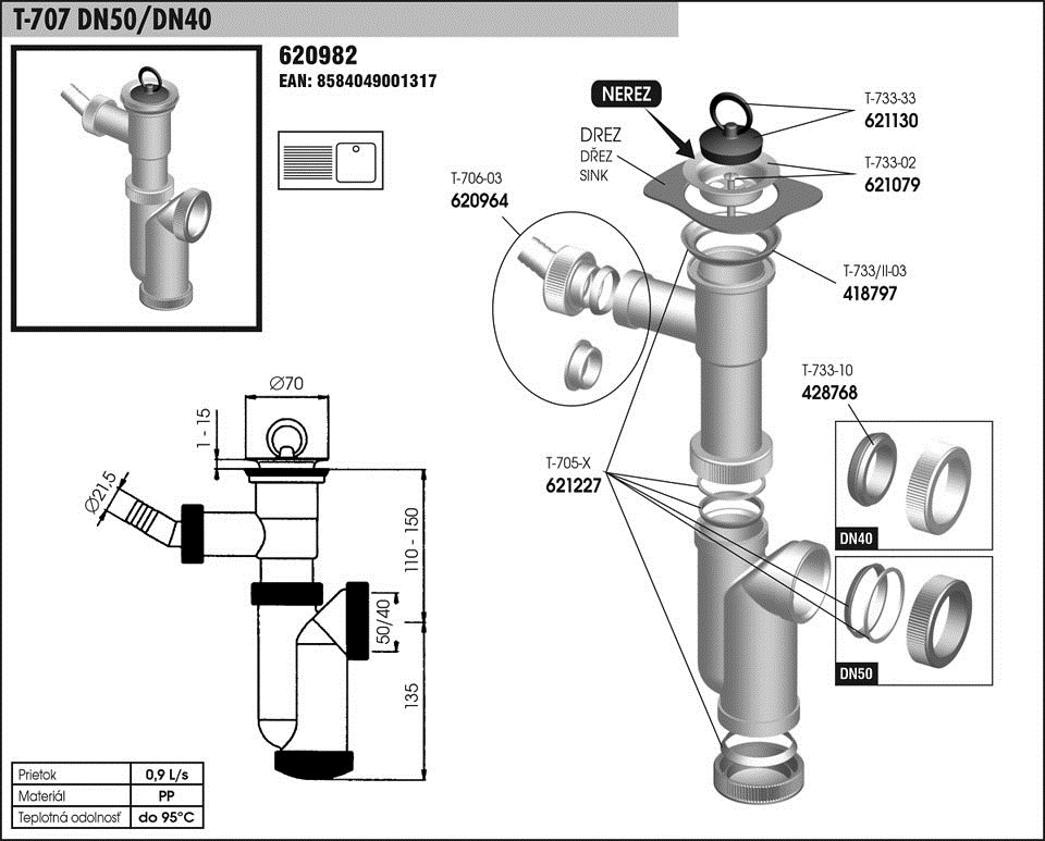 T 707 DN50/DN40 sifon dřez.s odb.chrom
