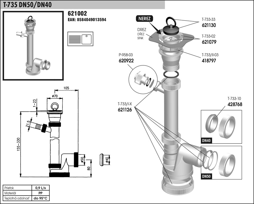 T 735 DN 50/DN 40 sifon dřezový-nerez