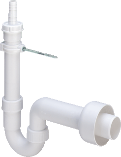 s vodorovným odtokem, pro hadici na odpadní vodu z pračky nebo myčky nádobí, s pryžovou vsuvkou do potrubí a nátrubkem, (vhodným k nastrčení nebo zastrčení hadice pro odpadní vodu), s upevněním na stěnu, kontrola jakosti podle DIN EN 274,Přípoje přístrojů a speciální přechodové kusy umožňují různé varianty připojení.