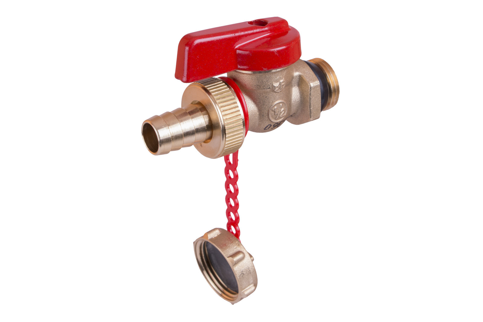 Vypouštěcí kulový kohout s integrovaným těsněním, vnější závity, s hadicovou vývodkou a zátkou. Ovládací krátká páčka - červená.